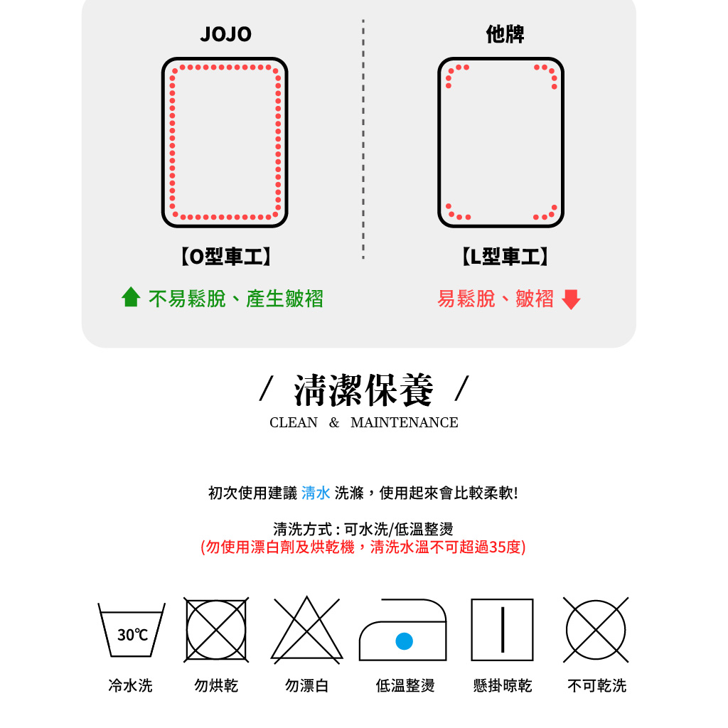 清洗方式:以冷水清洗晾乾即可。/ 請勿烘乾,避免高溫縮水/ 請使用中性洗劑,勿使用衣物柔軟精。